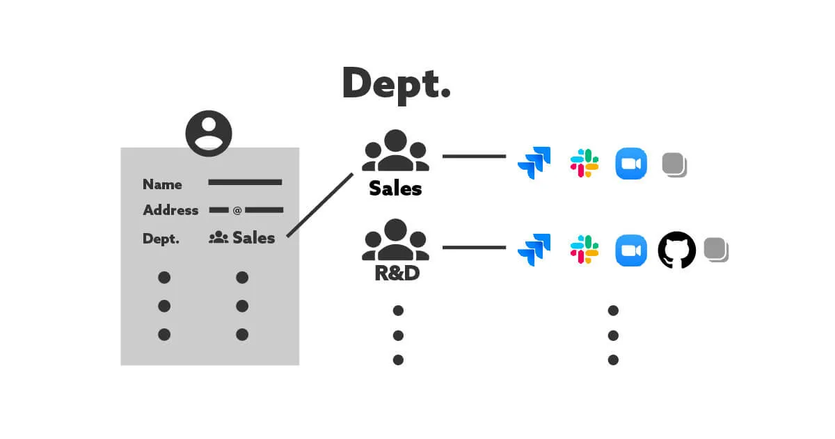 例えば営業部門所属のユーザーは必ずSalesforceに、開発部門所属のユーザーは必ずJIRAにアクセスする必要があるというように所属部門によって利用するシステムが決まっている場合は以下の例のようにすることで手動の操作を極力減らすことが可能になります。