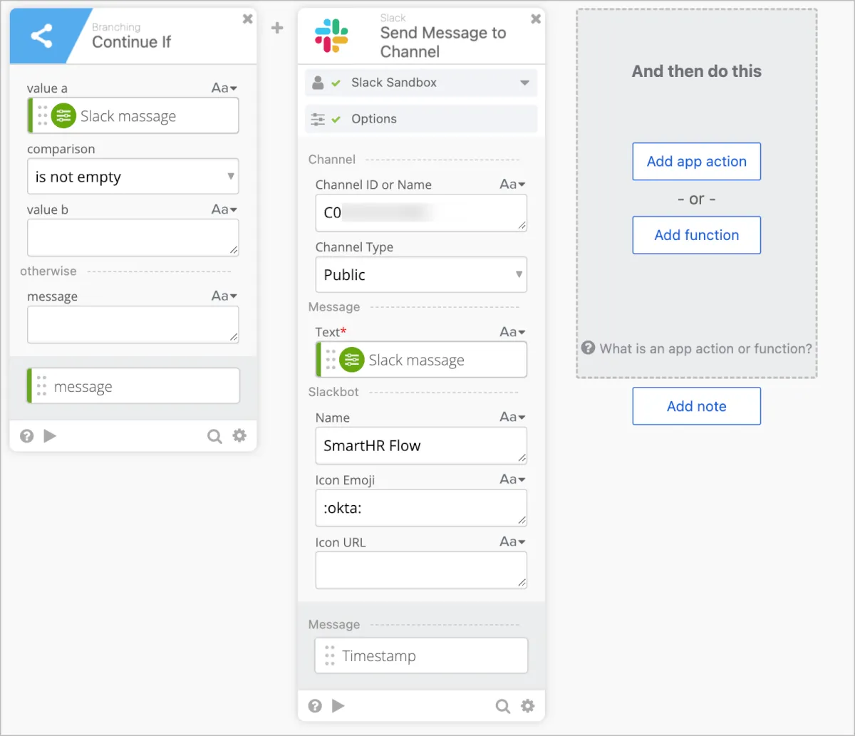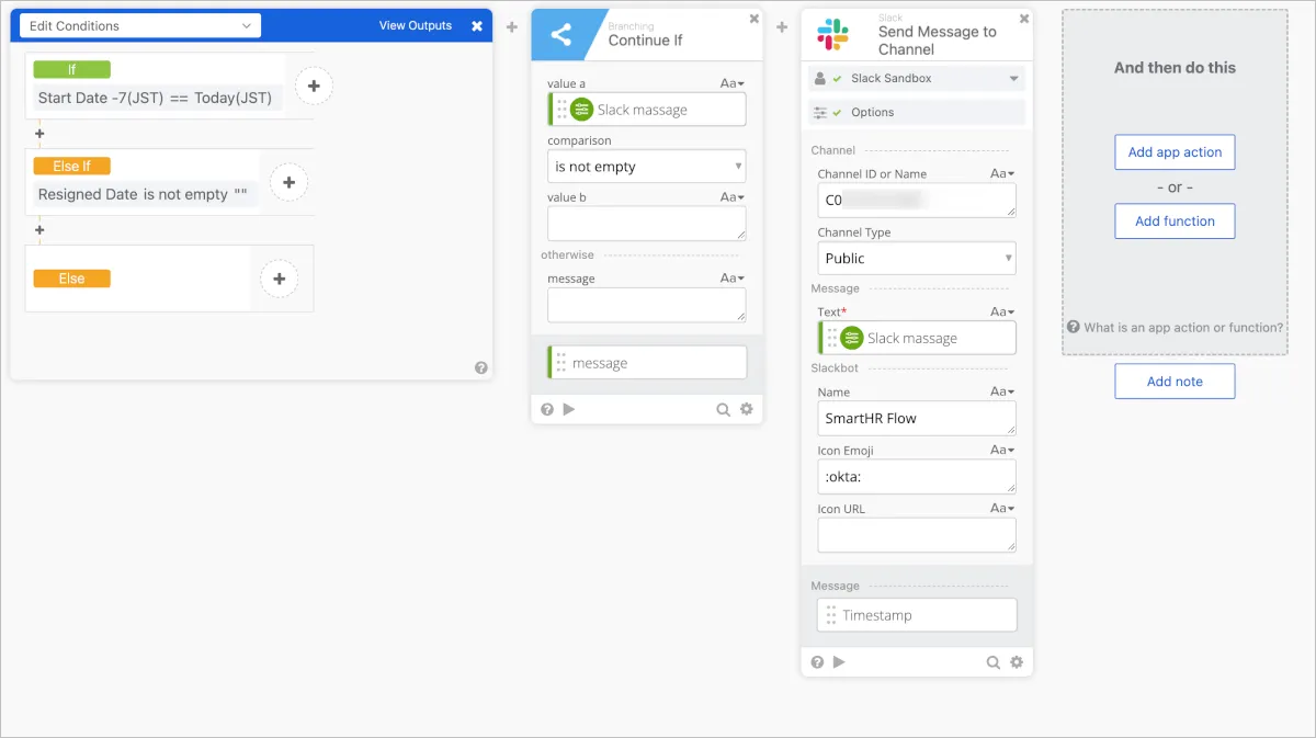 - Continue Ifカードにて、Slackへ投稿するメッセージが空でないことを確認
