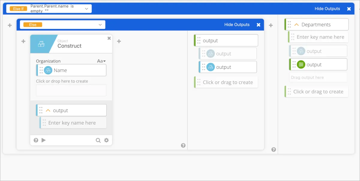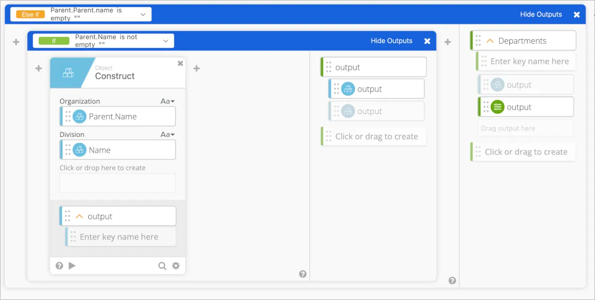 - If/Elseifカードにて、Parent.Parent.nameに値が入っていない場合にさらにParent.Nameが値が入っている場合は部署情報が部まで存在すると判定