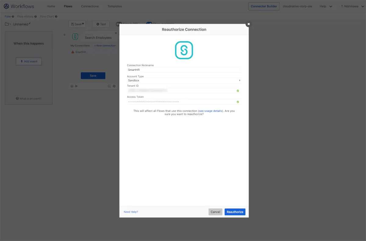 Tenant IDはSmartHRのサブドメイン部分を入力し、Access Tokenは事前準備のSmartHR側のアクセストークンの発行で発行した値を入力します。