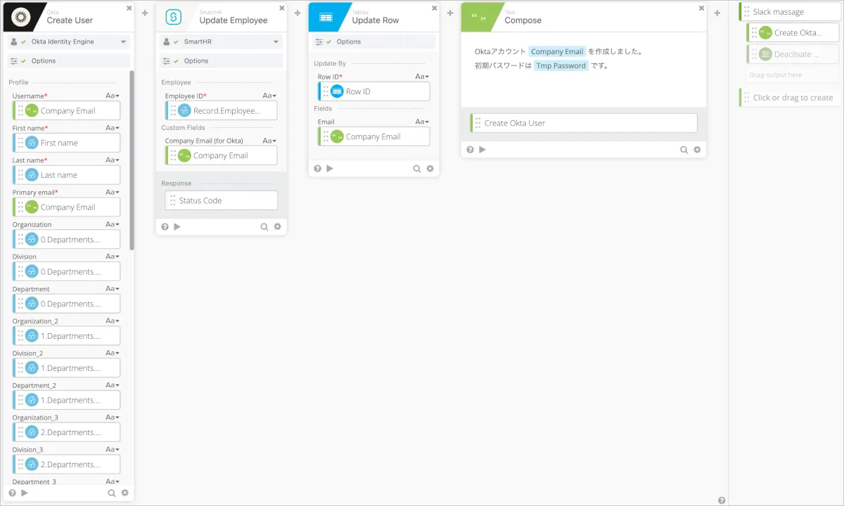 Okta Workflowsで入社済みのユーザーに対する処理はこのCompany EmailをキーにOktaユーザーと紐づけて処理を行います。