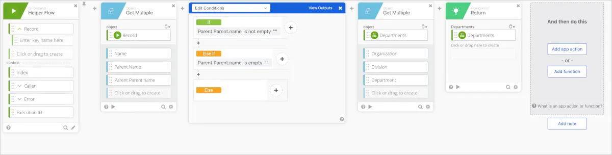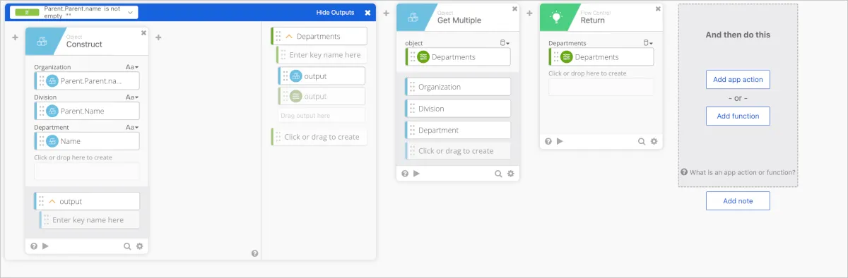 - Returnカードにて、呼び出し元Flowに再構築した部署情報を戻す