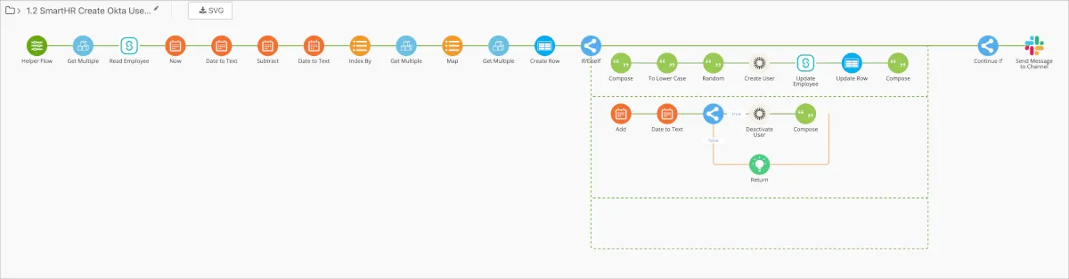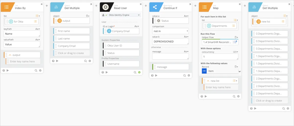 - Continue Ifカードにて、OktaのユーザーステータスがDEPROVISIONED以外である場合のみ後続の処理を実行