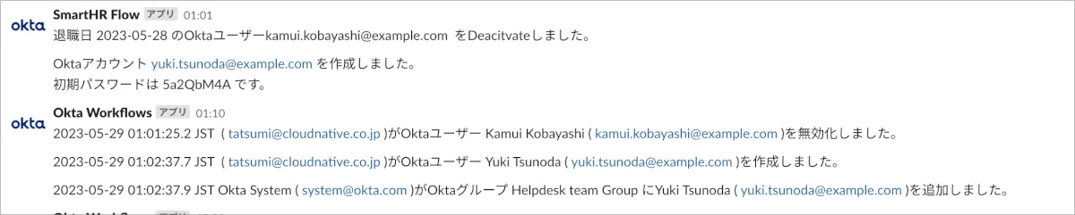Slack通知の01:10でユーザーが作成と同時にOktaグループ Helpdesk team Groupに追加されていることも確認できます。