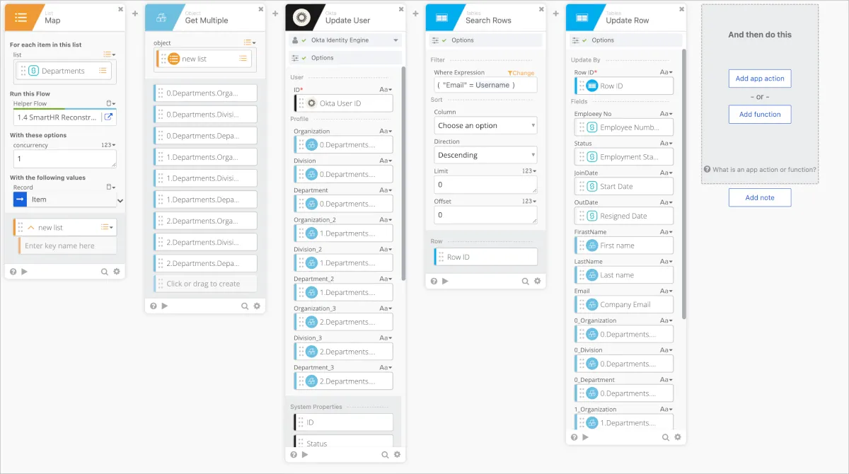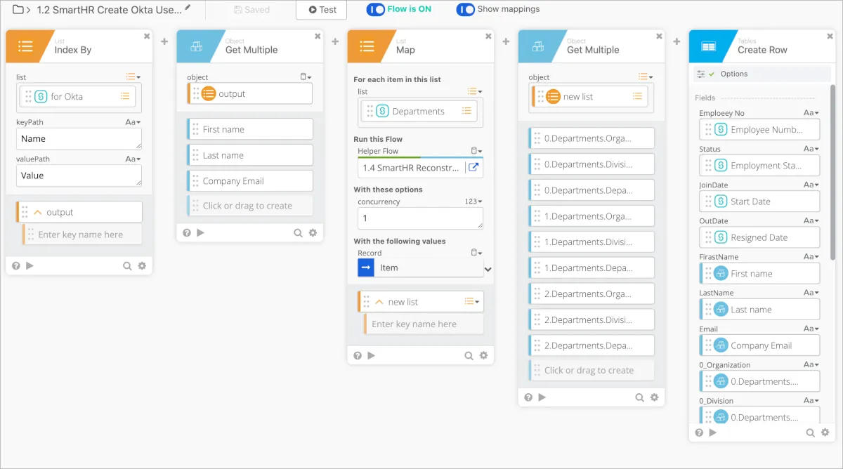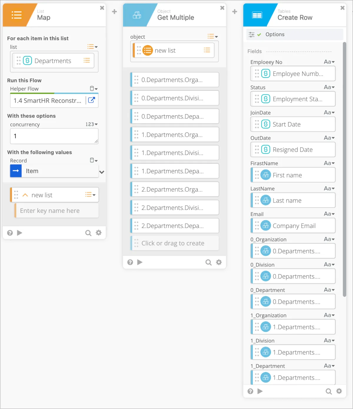 - Flow4:Flow 2,Flow3から呼び出されれ、SmartHRの部署情報の階層情報を再構築し、呼び出し元に返す