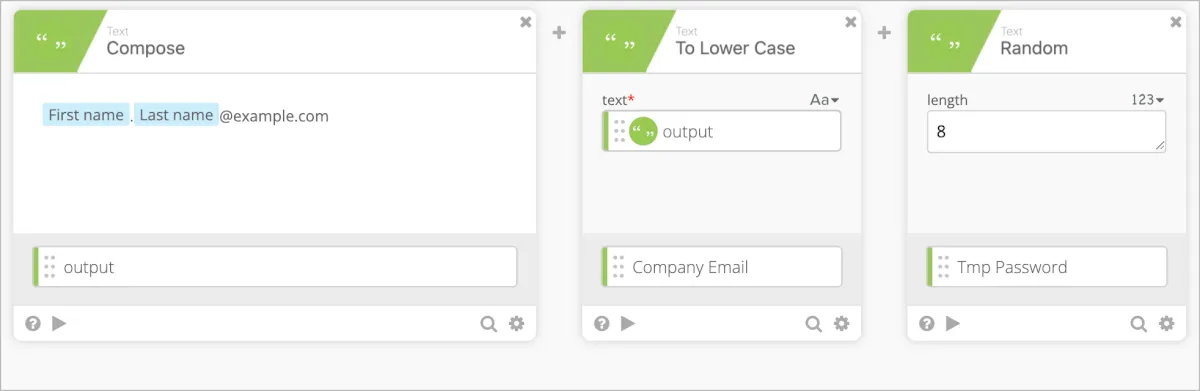 - Composeカードにて、First nameとLast nameからメールアドレスを作成