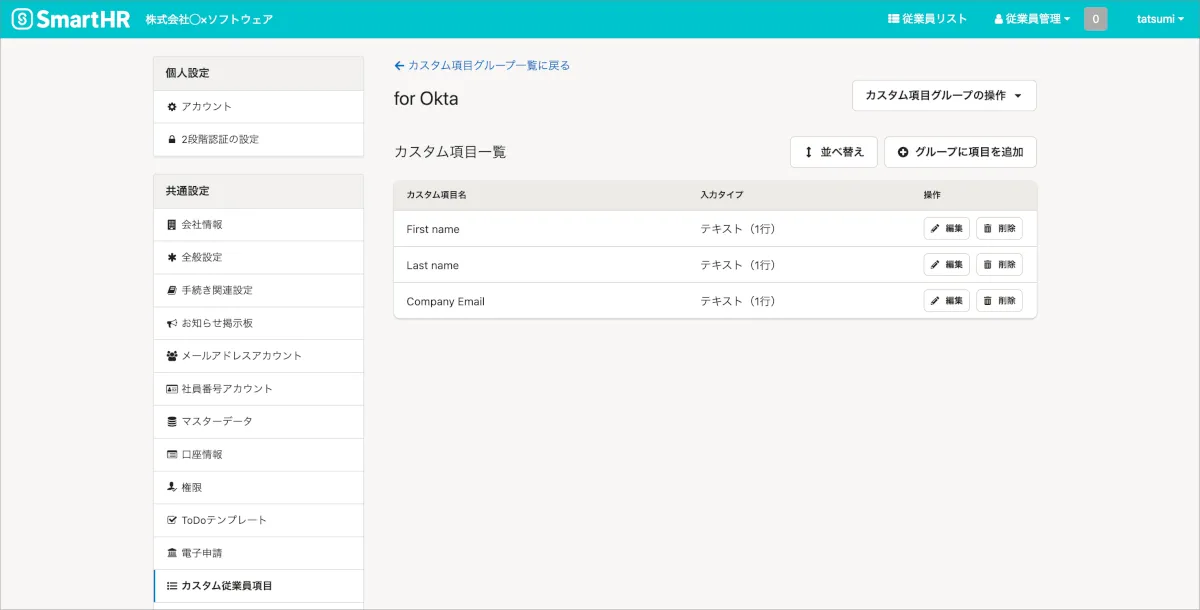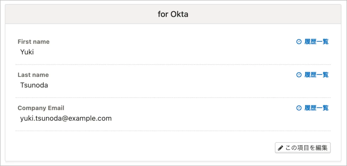 今回Oktaで新たにアカウントが作成されたユーザーのSmartHRのカスタム従業員項目のCompany Emailにも値が反映されています。