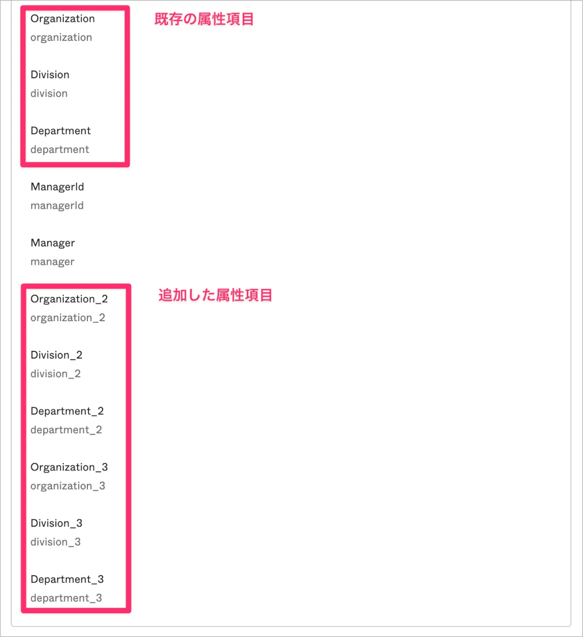 今回はOrganizationにSmartHRで定義した本部を、Divisionに部を、Departmentにチームを割り当てることとしますが、SmartHRで表現できる部署情報はあと2セット分が必要です。そこで以下のようにカスタム属性として追加しました。