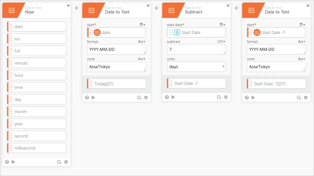 - これも次のDate & TimeのDate To Textカードにて、タイムゾーンをJSTに変換