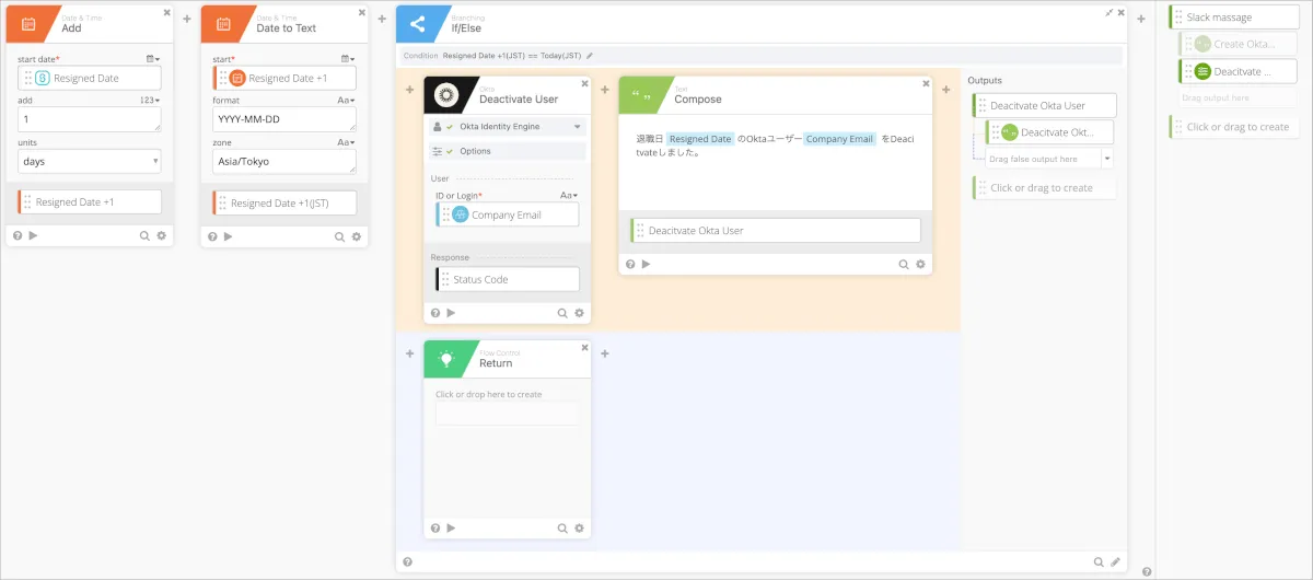 - 当日である場合にOkta Deactive Userカードにて、OktaユーザーをDeacitvateとする処理