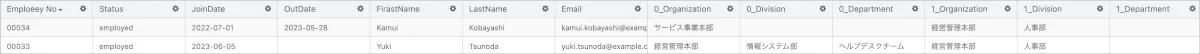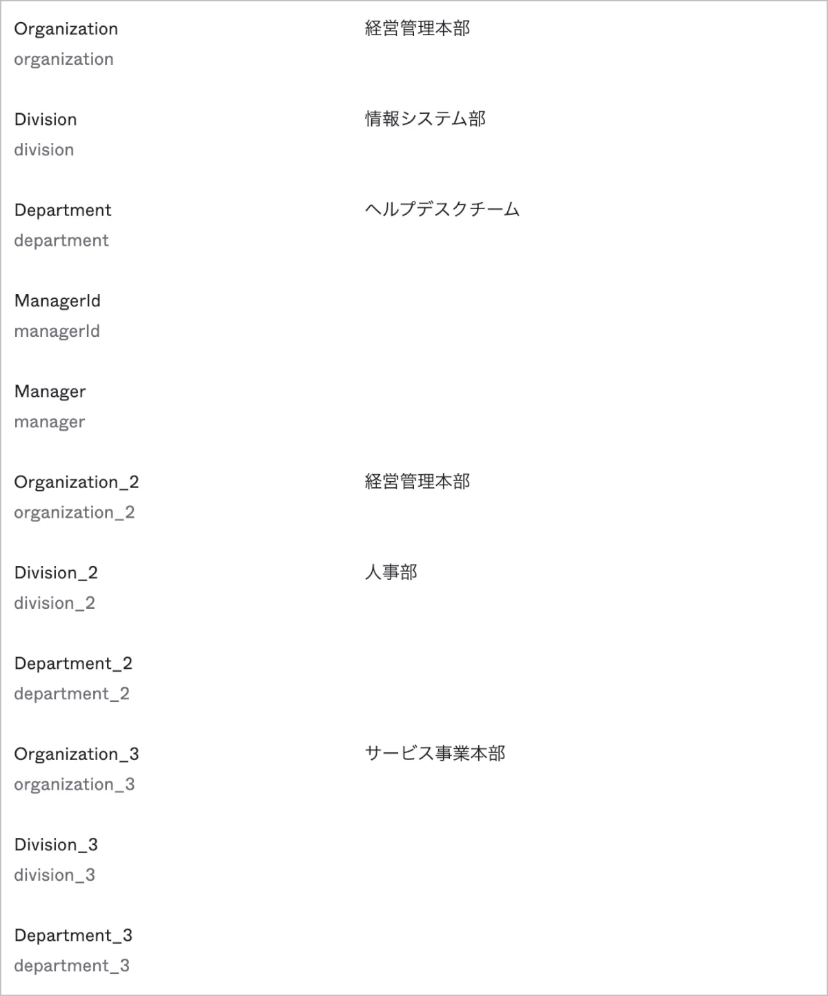 0_Organization,0_Division,0_Departmentに部署情報の1つ目が格納されます。さらに2つ目と3つ目の部署情報を格納するための1_Organization,1_Division,1_Departmentと2_Organization,2_Division,2_Departmentもカラムとして用意しておきます。