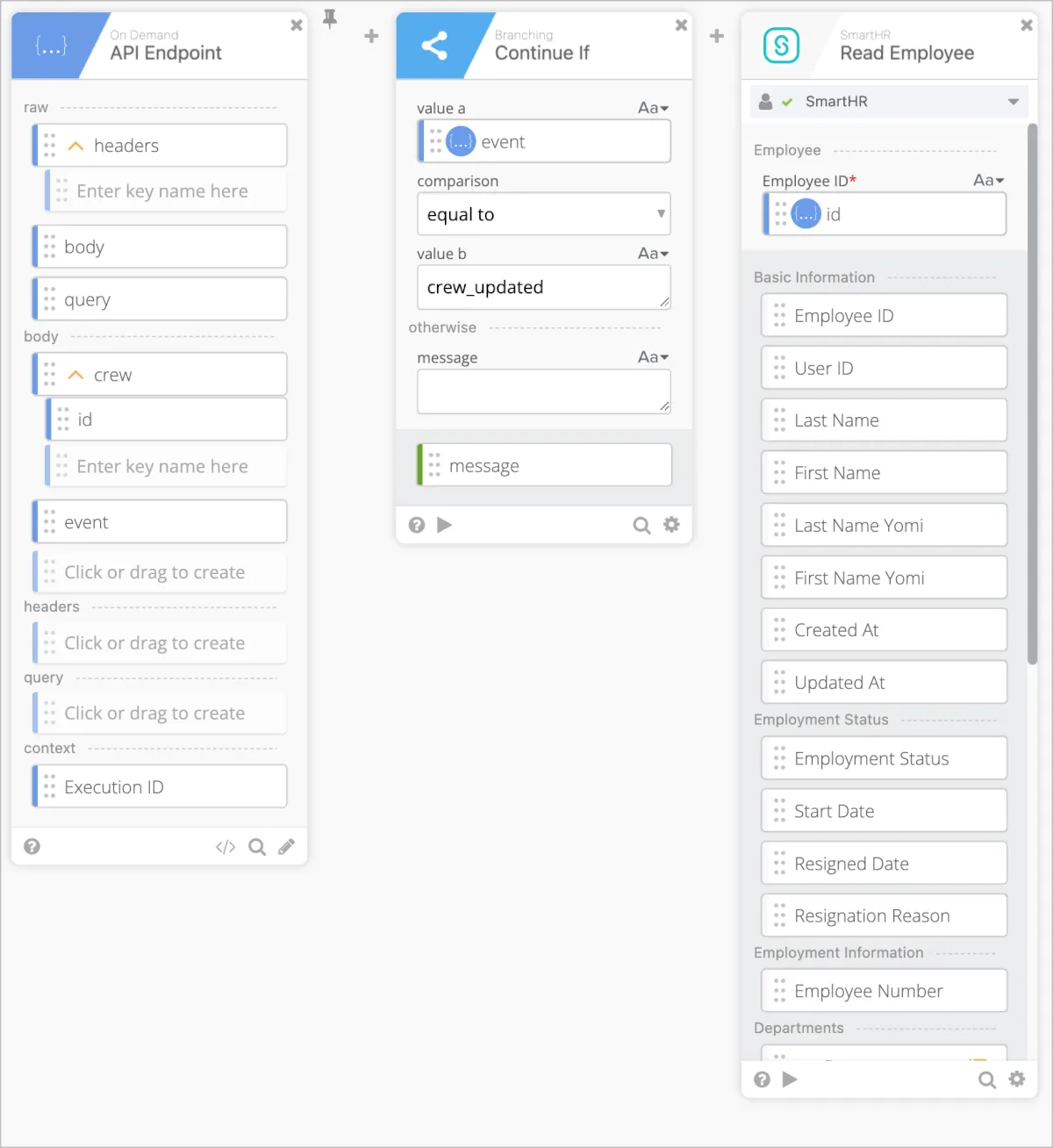 - Continue Ifにてeventがcrew_updatedを指定し、従業員情報が更新された場合のみ後続の処理を実行