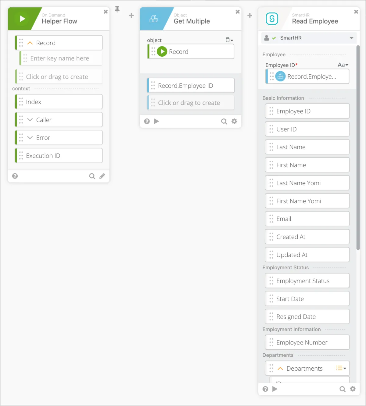 - Get Multipleにて、先ほどのオブジェクトを指定し、Record.Employee IDにてSmartHRのIDを取得