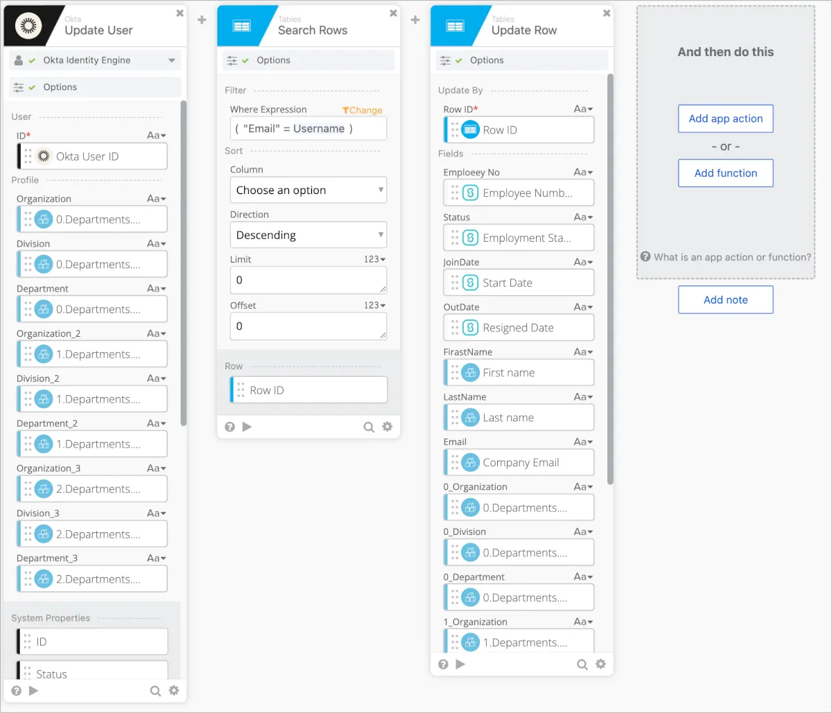 - Okta Update Userカードにて、OktaユーザーIDを指定し部署情報を更新