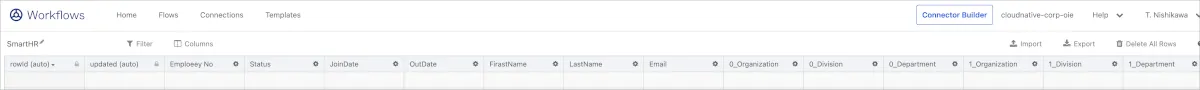 - Flow2:Flow 1の情報を受け取って入退社の処理を実施