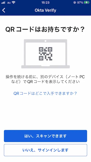- 「QRコードはお持ちですか?」で”はい、スキャンできます”を選択し、Jamf Connect メニューバーアプリに表示されていたQRコードを読み取ります。