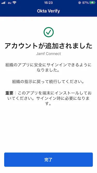 - 無事登録ができると「アカウントが追加されました」と表示されるので”完了”を選択します。