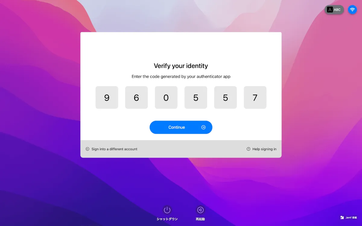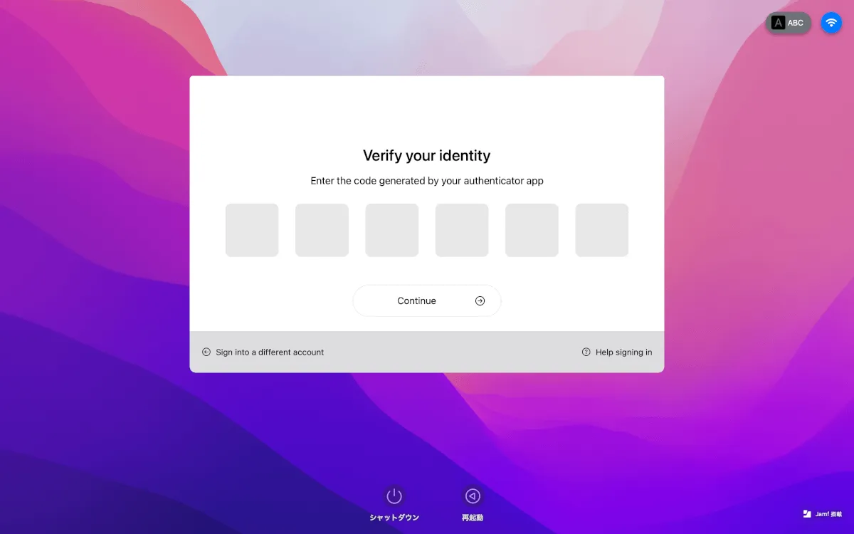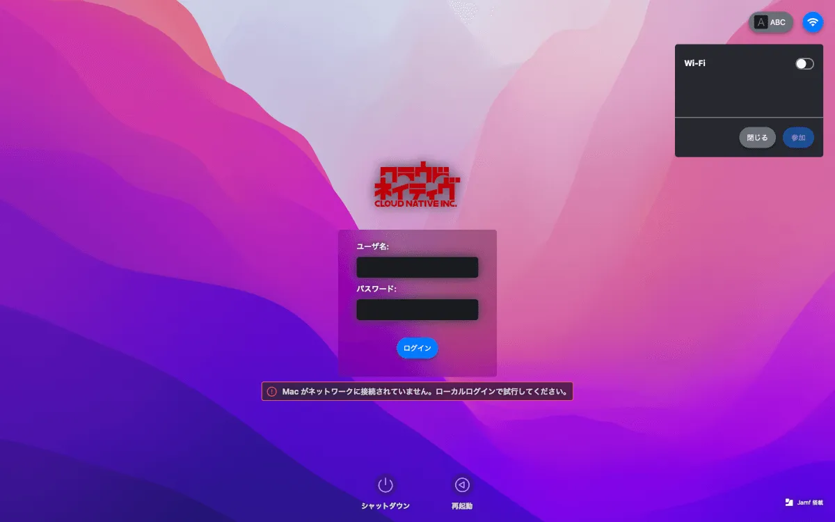 - Jamf Connect Loginの画面でWi-FiをOFFにしてみます。