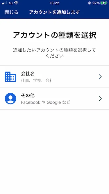 - iPhoneでOkta Verifyアプリを起動し、”+”ボタン > 「アカウントの種類を選択」で”会社名”を選択します。