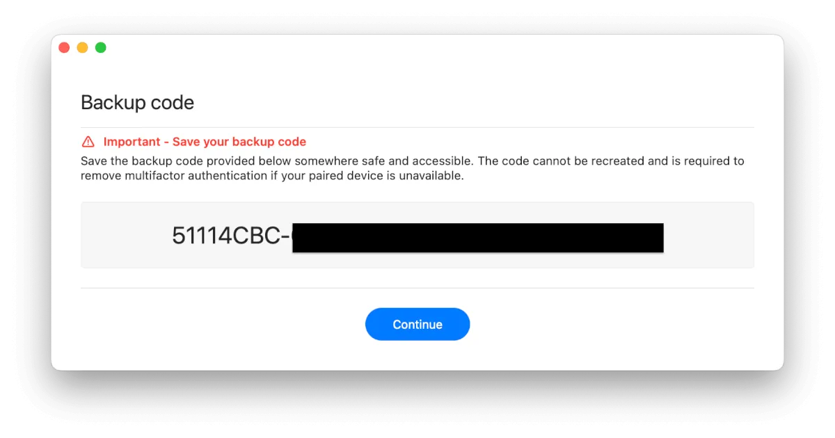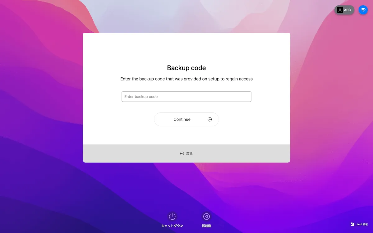 - Backup codeが生成されますので保存して”Continue”を選択します。認証アプリが使えなくなった場合などに必要になります。このあたりの収集もJamf Proでできたらいいですね・・・
