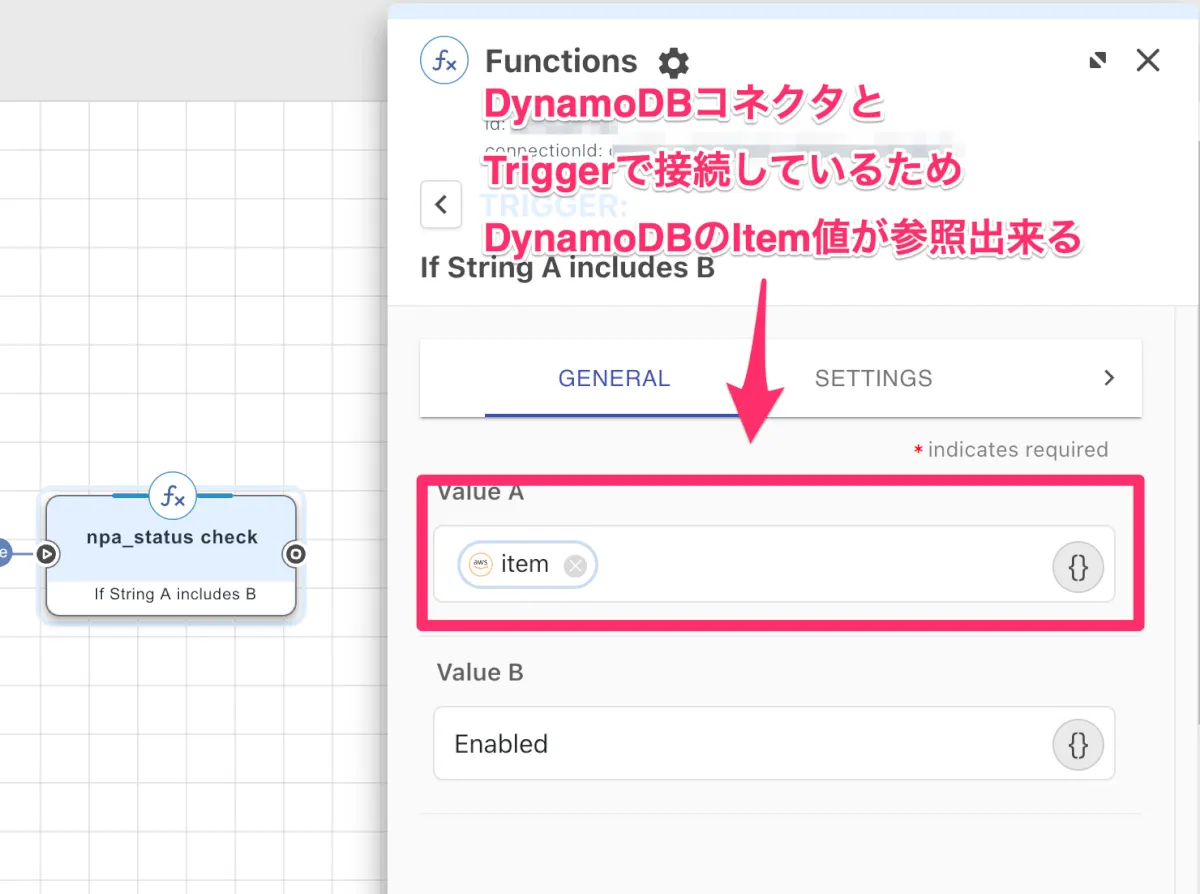 値の評価にはFunctionコネクタを利用します。DynamoDBコネクタとTriggerで接続します。DynamoDBから取得した値に Enabled が含まれる、つまり端末上で Netskope Private Access Device Status が有効になっているかを判定します。