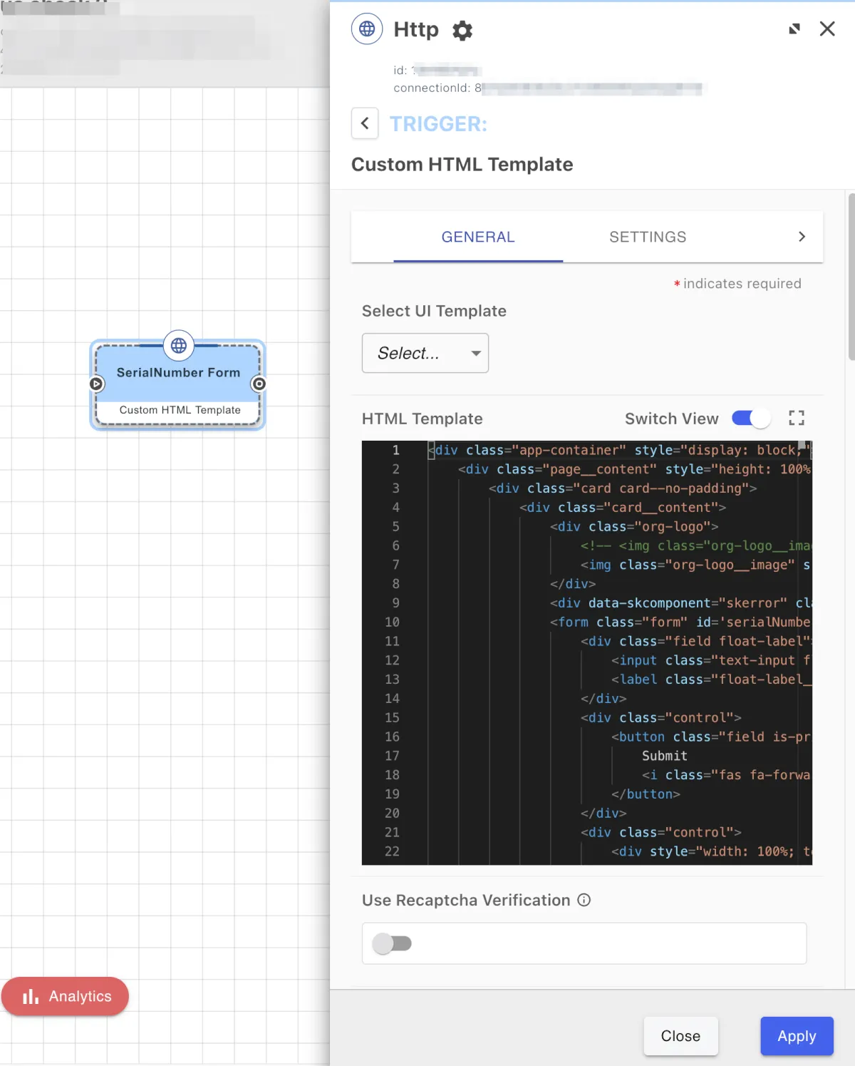 Httpコネクタを追加し、Custom HTML Templateを選択し入力フォームを作ります。 Sample Flowの入力フォームを参考にすれば特に難しいことはないかと思います。もちろんCSSなどでカスタムも可能です。