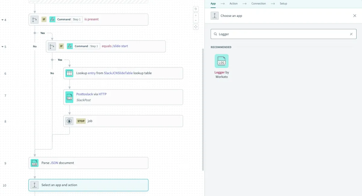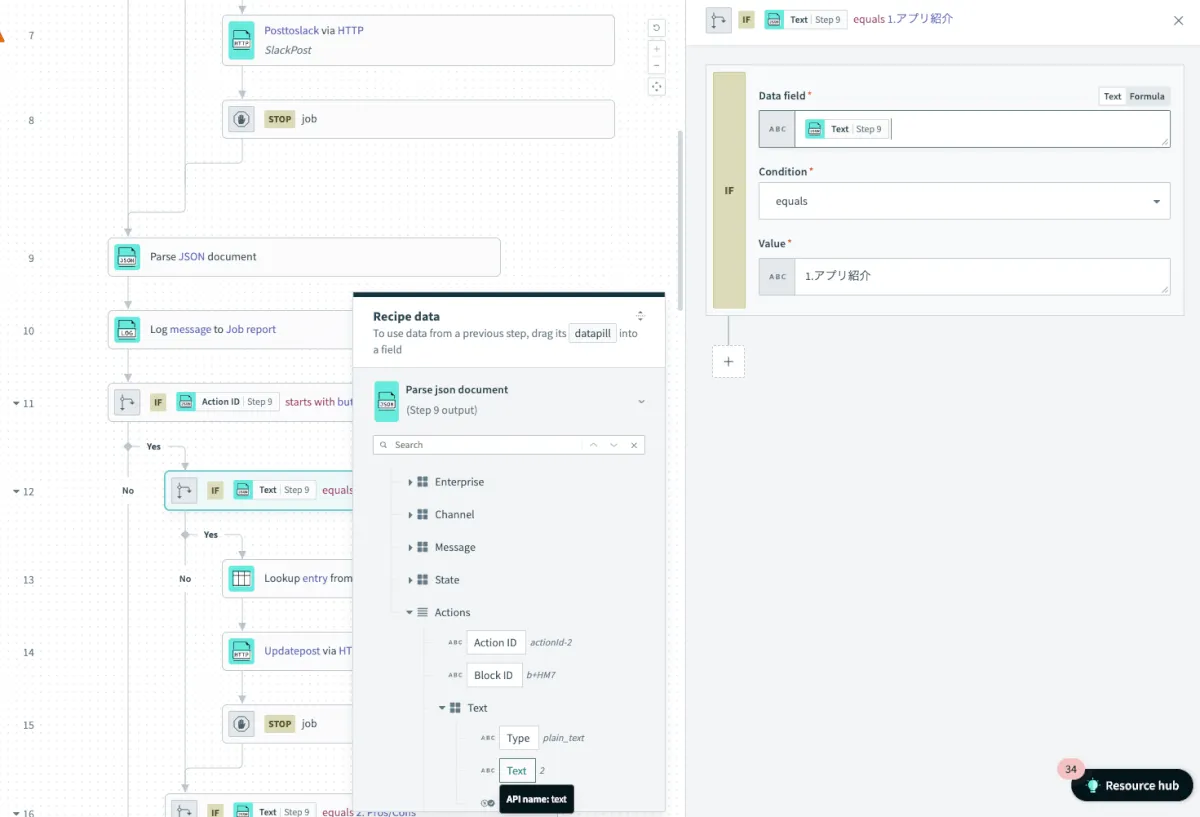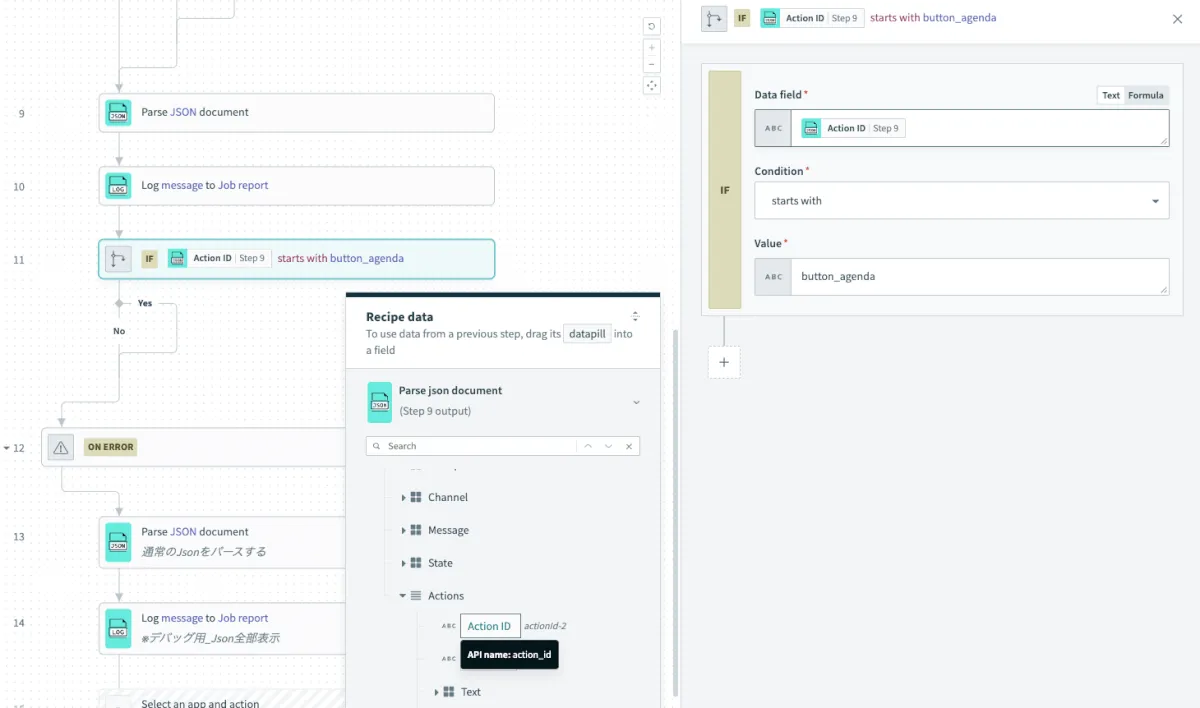 Loggerアクションを追加してFormula に変更し、Step9 のText を選択して以下数式にする