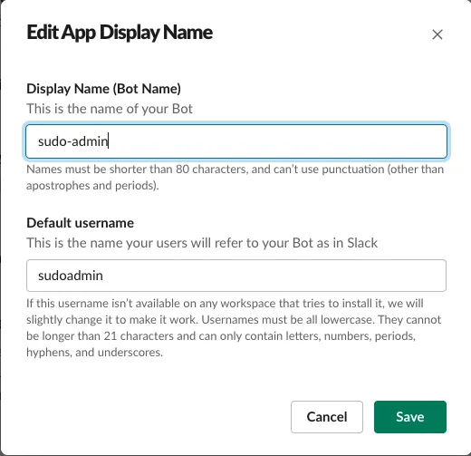 Bot Name、Defoult user nameを入力して[Save]をクリック