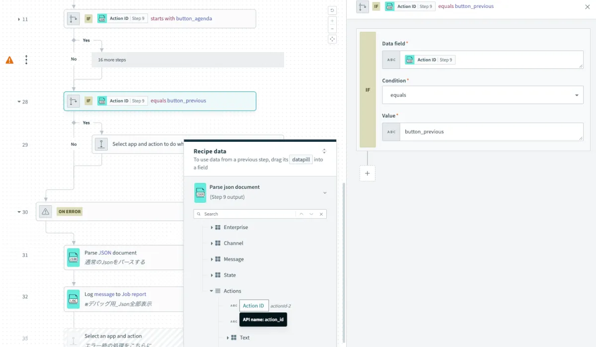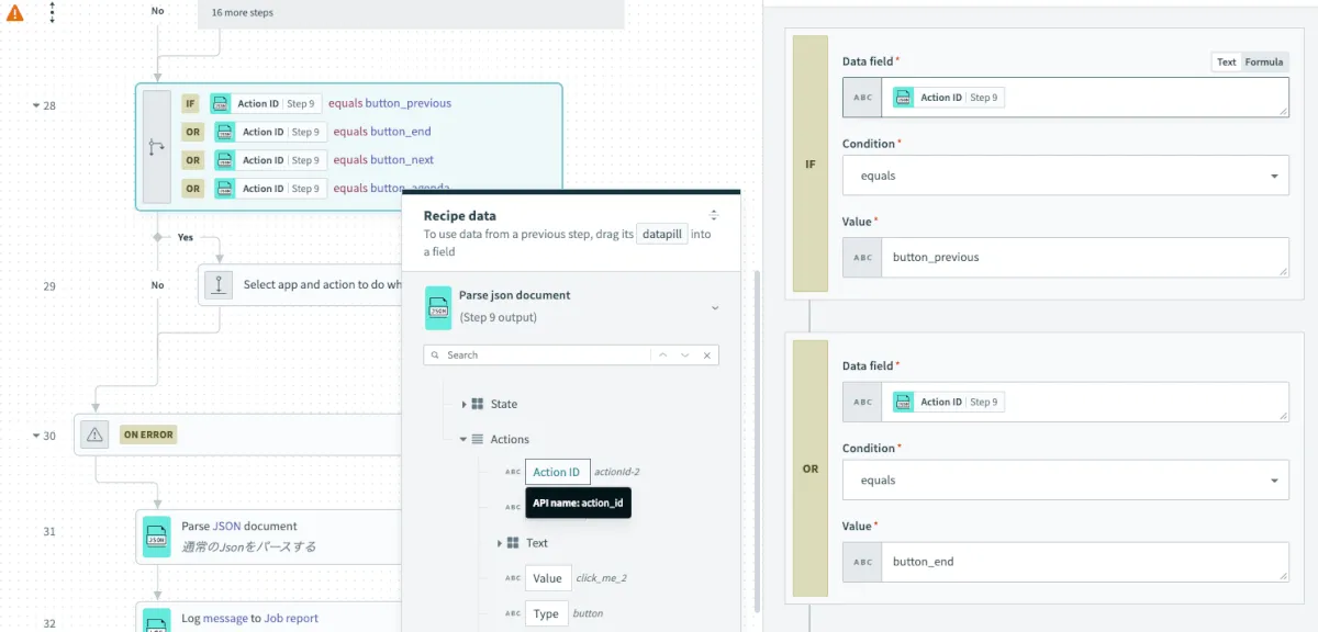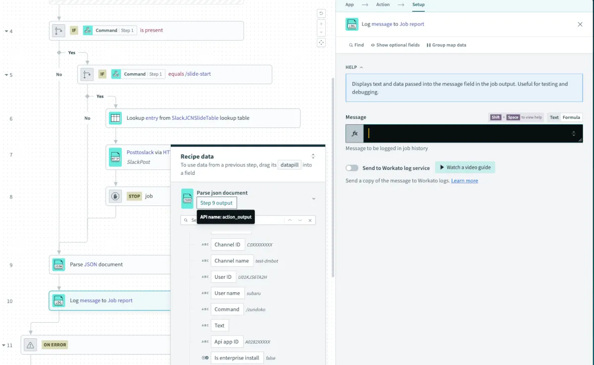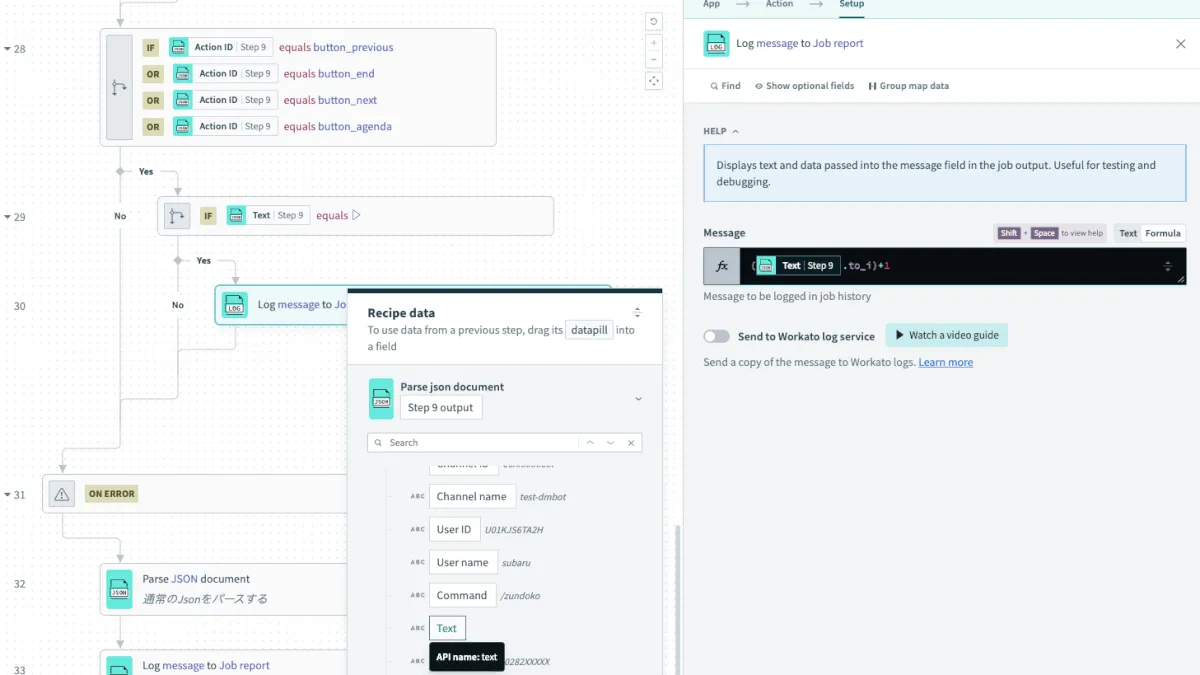 後続のStep32でSlackのリクエストBodyでは数式埋め込みができないため、Loggerアクションでデータピルを作成します