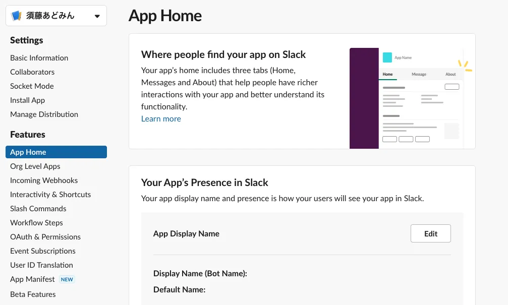 App Homeをクリック