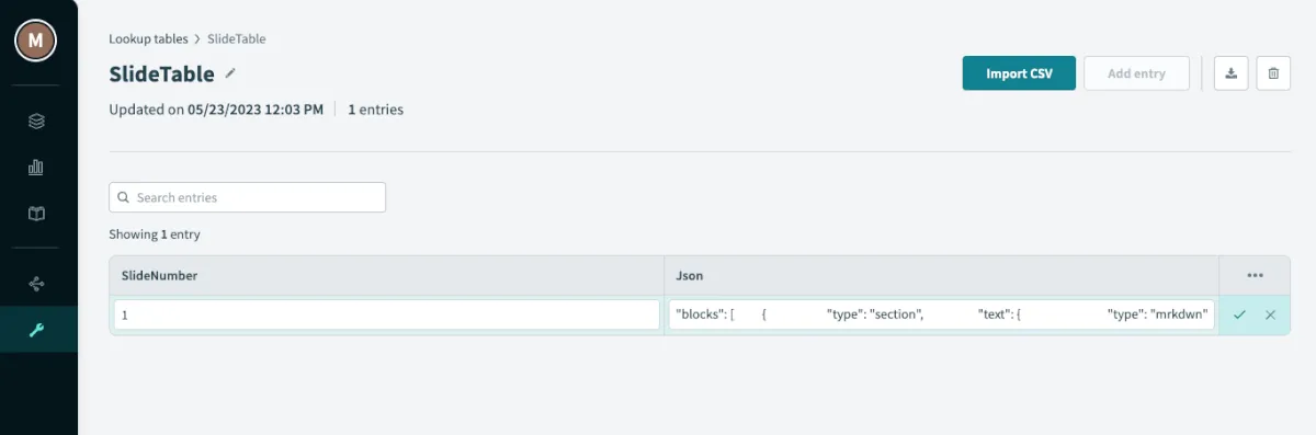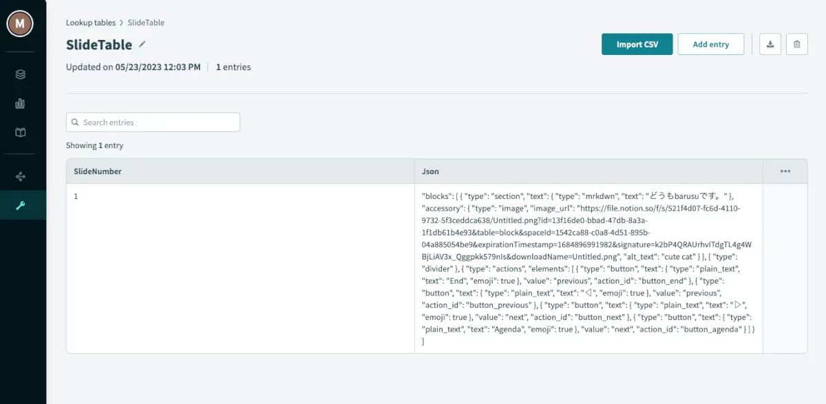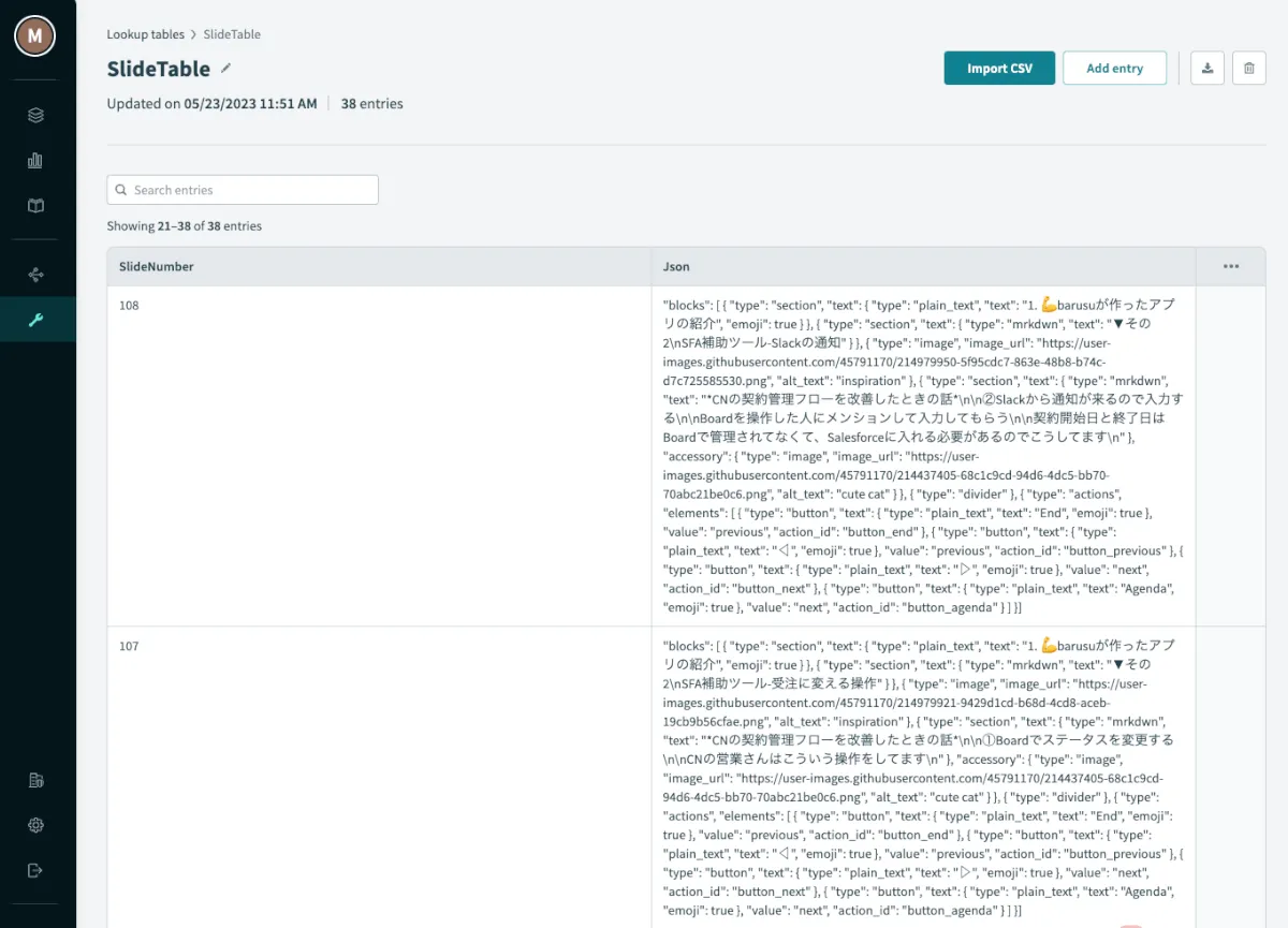- スライドの内容変えたいとかなるとJsonを変更してLookupTableに入れてってやるので、慣れが必要