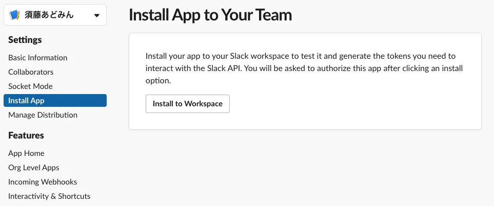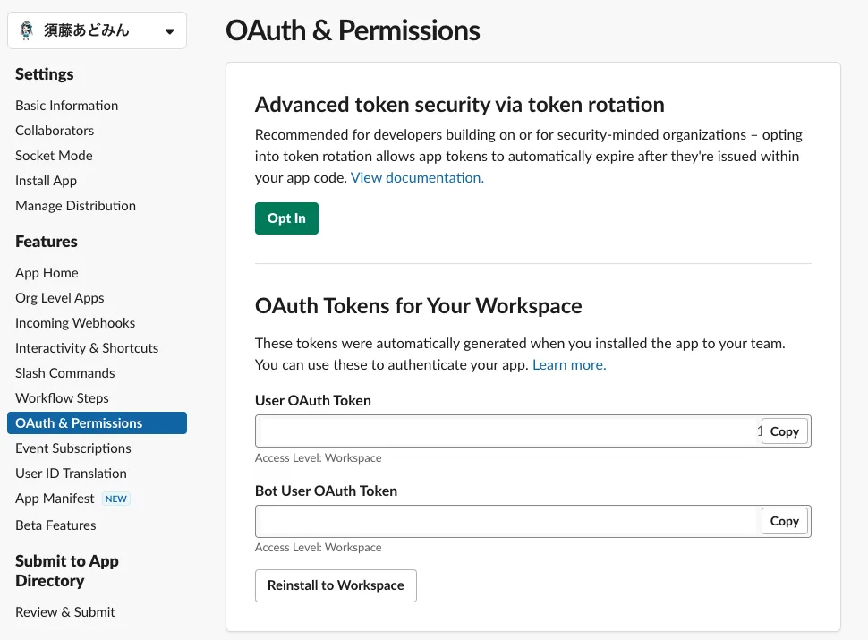 インストール後、OAuth & PermissionsのBot User OAuth Tokenの値を控えておく