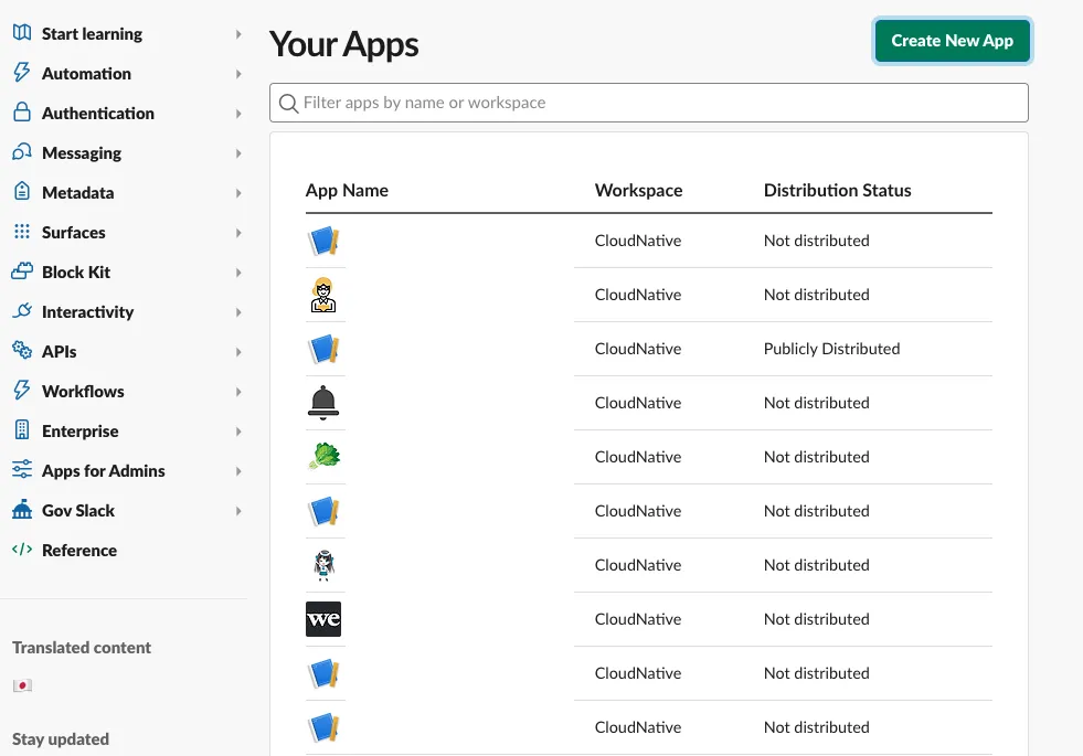 https://api.slack.com/apps にてCreate New APP をクリック