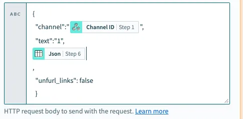 | Textの下の[json] | Step13 の json を指定 ※末尾にカンマを忘れずに |