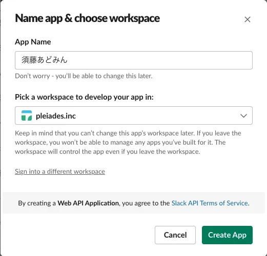 アプリ名を入力し、インストール先のWorkspaceを選択してCreate Appをクリック