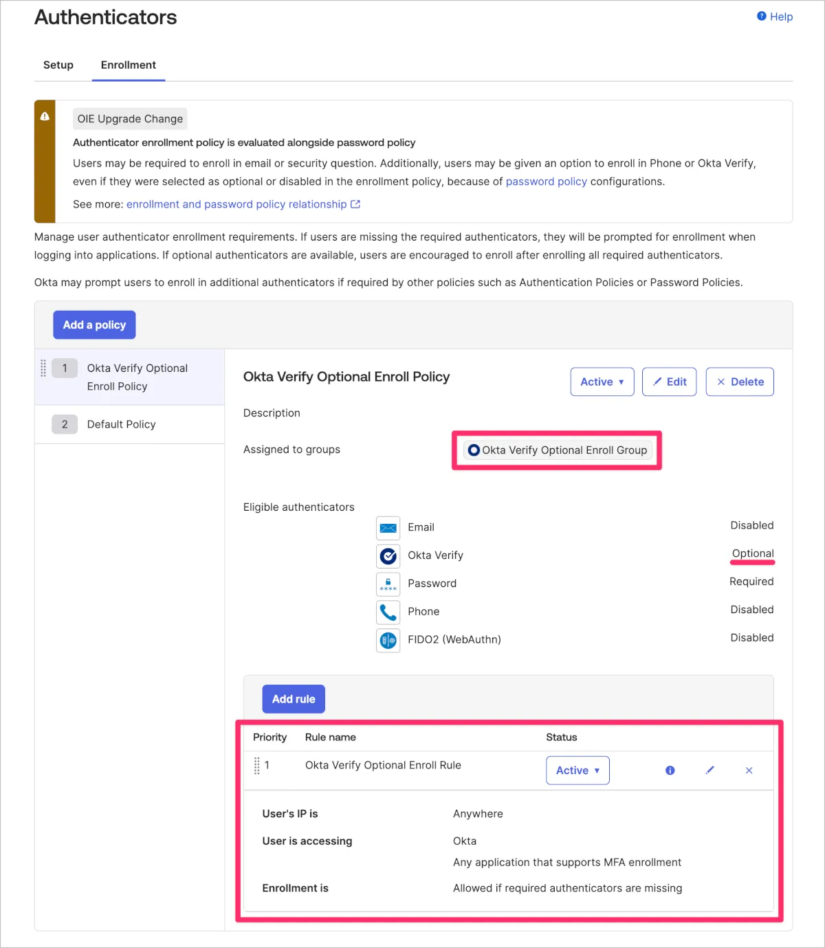 次に今回のキーポイントであるアクティベーション時に要求するAuthenticatorについて定義します。ここでも下図のようにPolicyを追加し、先ほど作成したグループのみを指定し、Okta VerifyをOptionalとします。