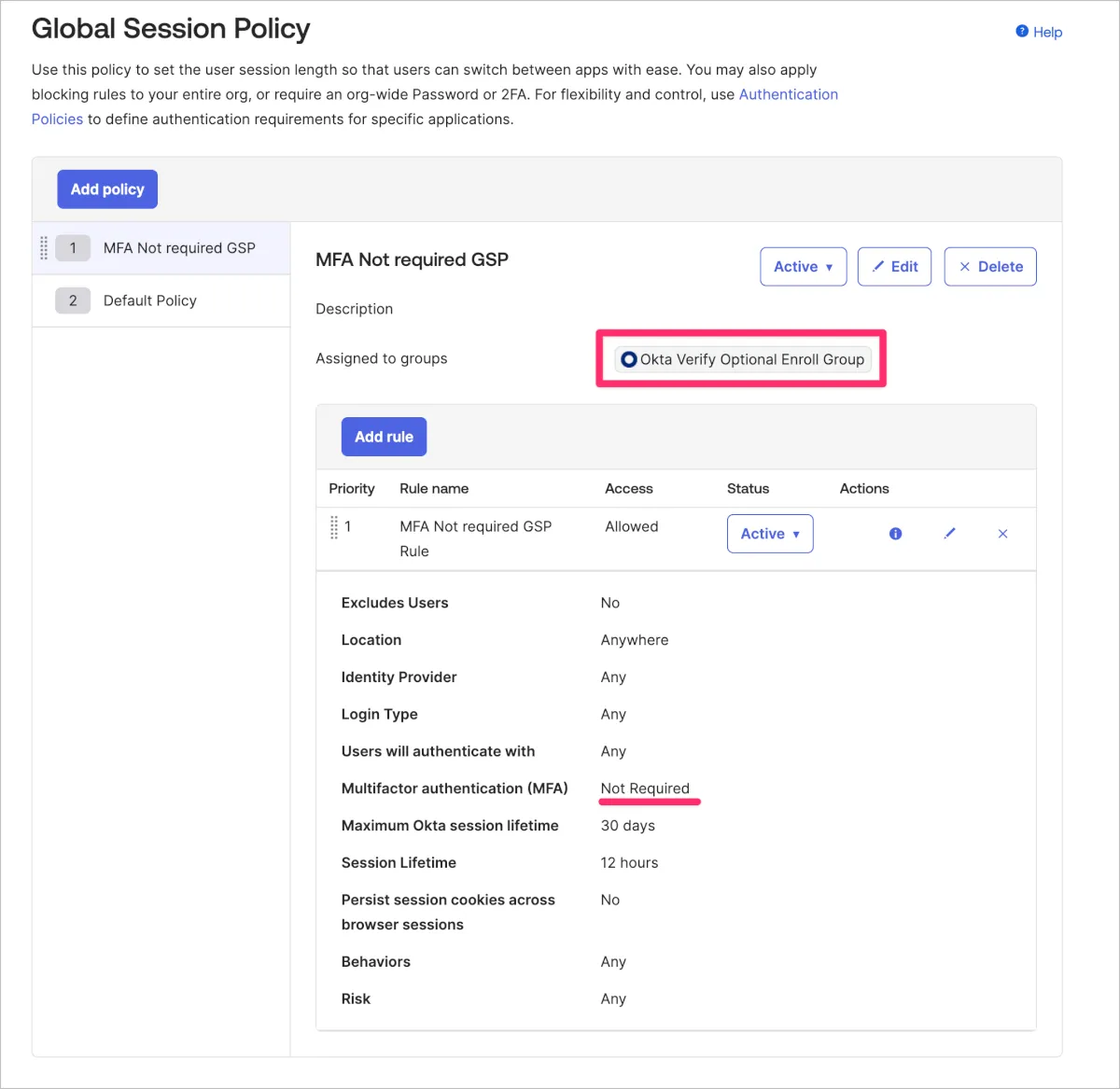 そこで下図のようにPolicyを追加し、先ほど作成したグループのみを指定します。Policy内のRuleではMultifactor authentication (MFA)をNot Requiredと指定します。
