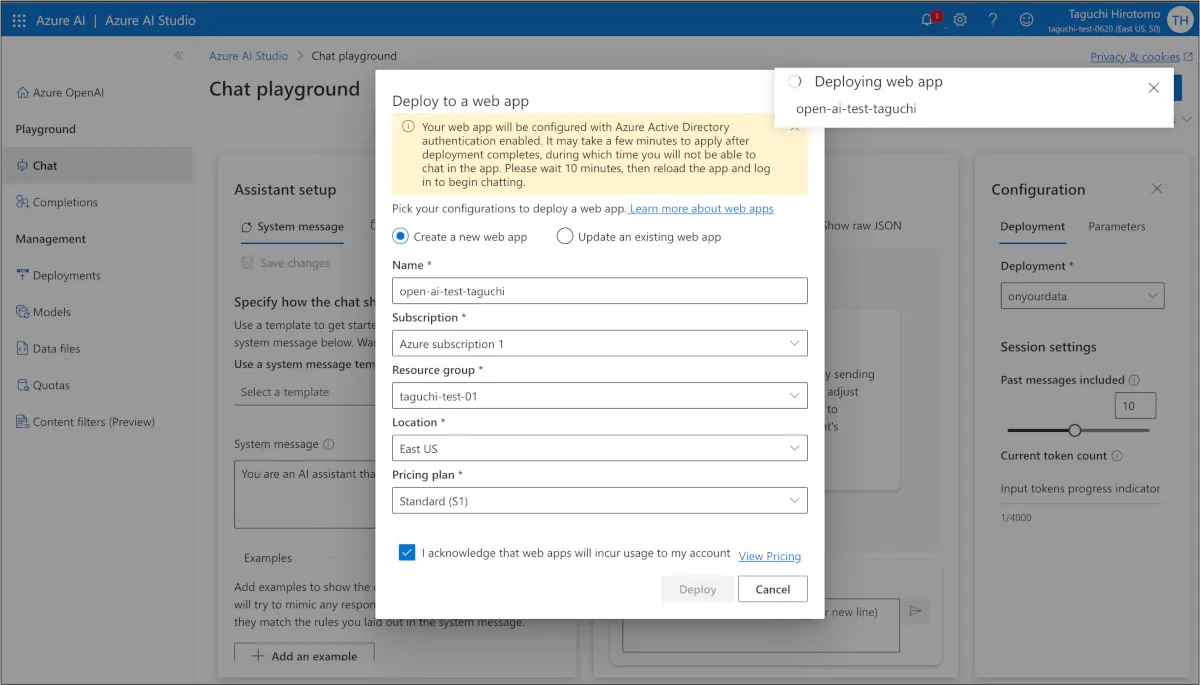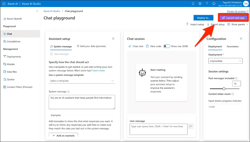 ここからは動作確認をしていきます。10分ほど待って、デプロイが完了すると、[Azure OpenAI Studio] > [chat]の右上に [Launch web app] という項目が出現します。