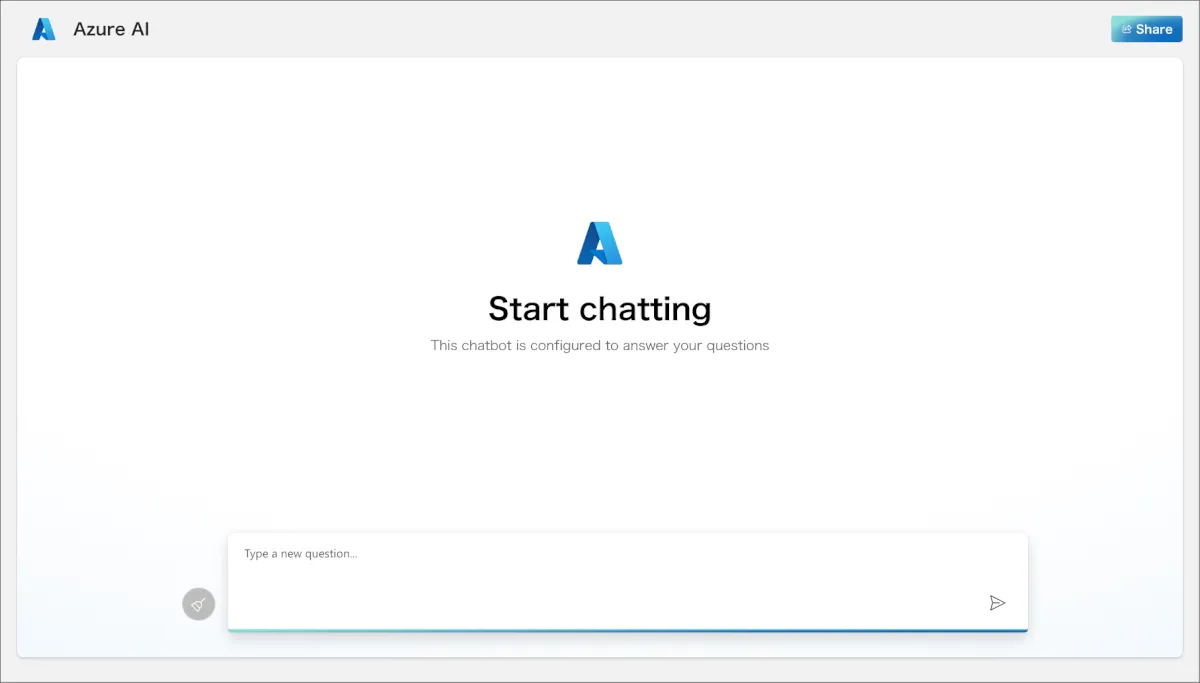 そこをクリックすると、Web UIのチャットが立ち上がり、ChatGPTを利用できるようになりました。右上に設置している [Share] を使って、社内ユーザーに展開することもできます。