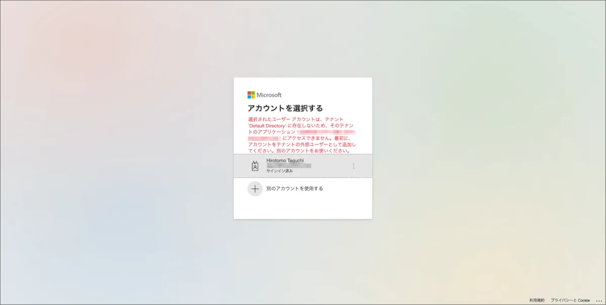 すごく嬉しいポイントとしては、デフォルトでAzure ADで自社テナントユーザーのみしかアクセスできない設定となっている点です。自社のAzure ADユーザー以外がアクセスを試行すると以下のような状態となり、アクセスすることができませんでした。