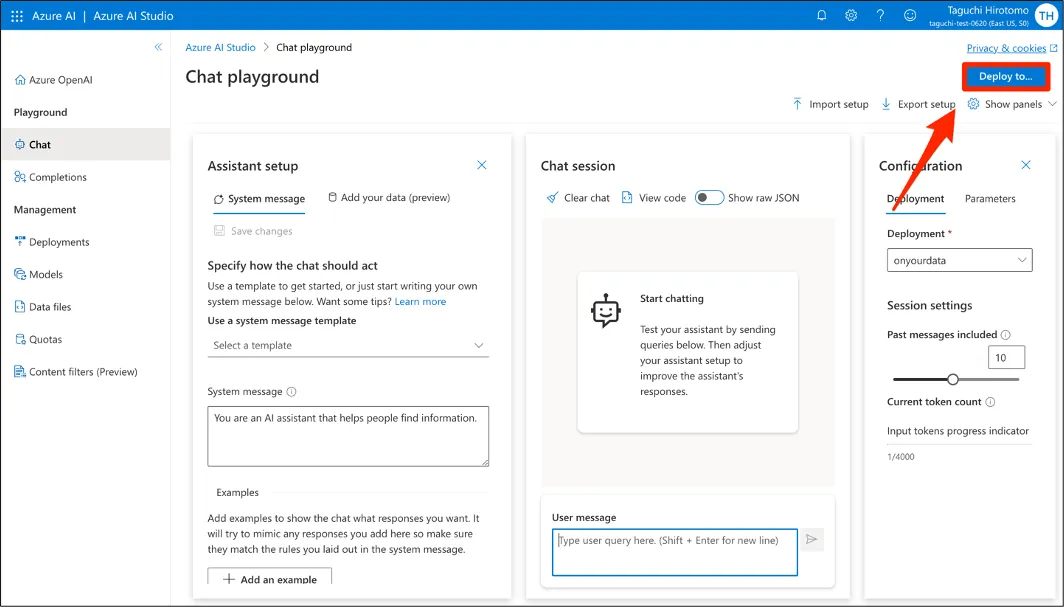 続いて、Azure OpenAI Studio(https://oai.azure.com/portal/)で[chat]欄を開き、右上に表示されている [Deploy to…] をクリックします。
