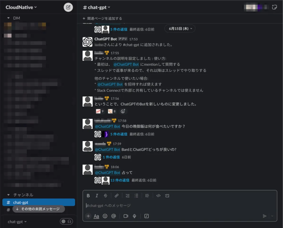 - 公開チャネルで実施した場合、他のユーザーもそのやり取りを閲覧できるので、他のユーザーへの学習効果やChatGPTが誤った回答をした場合に気づくキッカケとなる。(ChatGPTは適当なことを回答することが多く、その回答を鵜呑みにすると事故に繋がります。)
