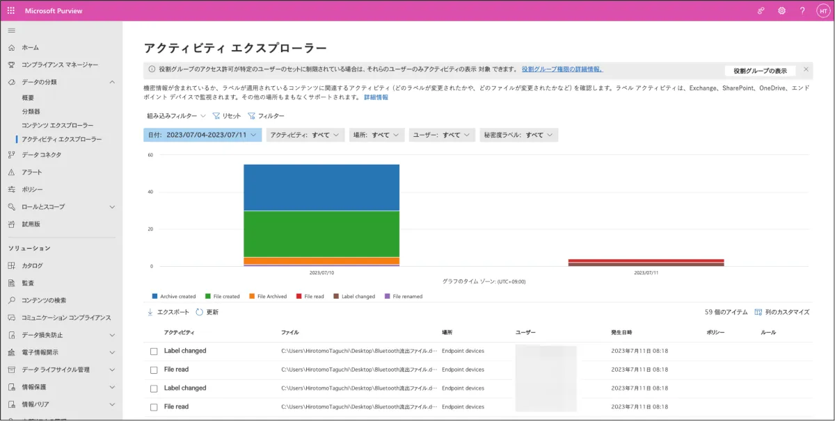今回の構成では、特定のMPIPの機密度ラベルをキーに検出しますが、ラベルの変更などが行われると抜け道となってしまいます。その対策として、ラベルの変更ログを閲覧するなどして監査を行うなどの手法が考えられます。その場合は、Microsoft Purview コンプライアンス ポータルの [データ分類] > [アクティビティエクスプローラー] からラベルの変更ログを確認することができますのでここから確認してください。