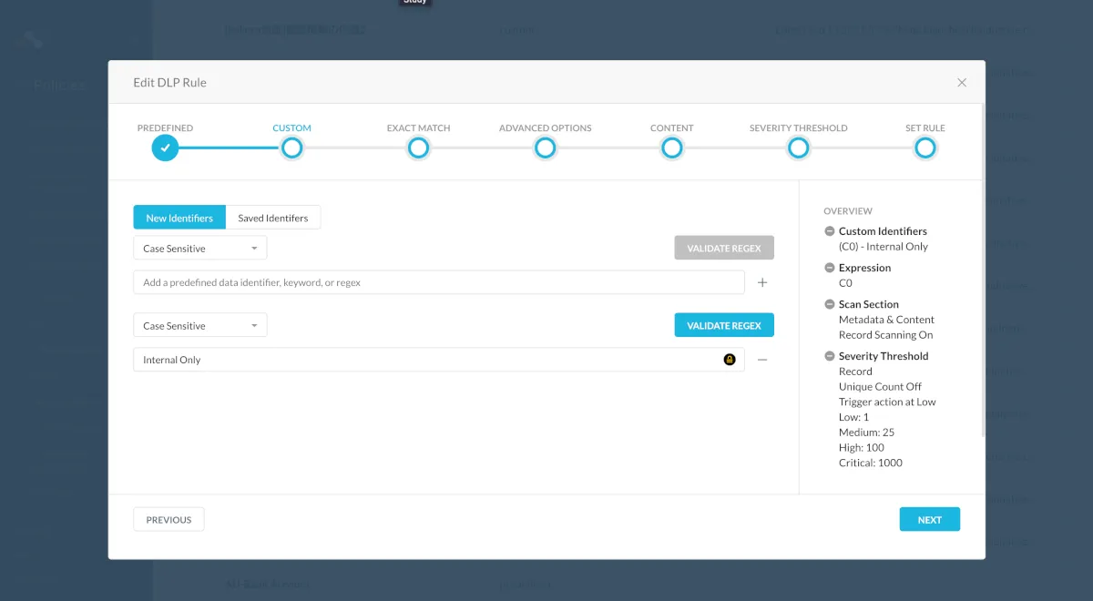 最後にNetskopeのDLPの設定を入れます。まず、[Policies] > [DLP] > [Edit Rule] > [Data Loss Prevention Rules] > [NEW RULE]から、DLP Ruleを作成します。[CUSTOM]の部分に検出したい文字列を入力します。作成後は、[APPLY CHANGES]を利用してルールを有効化します。