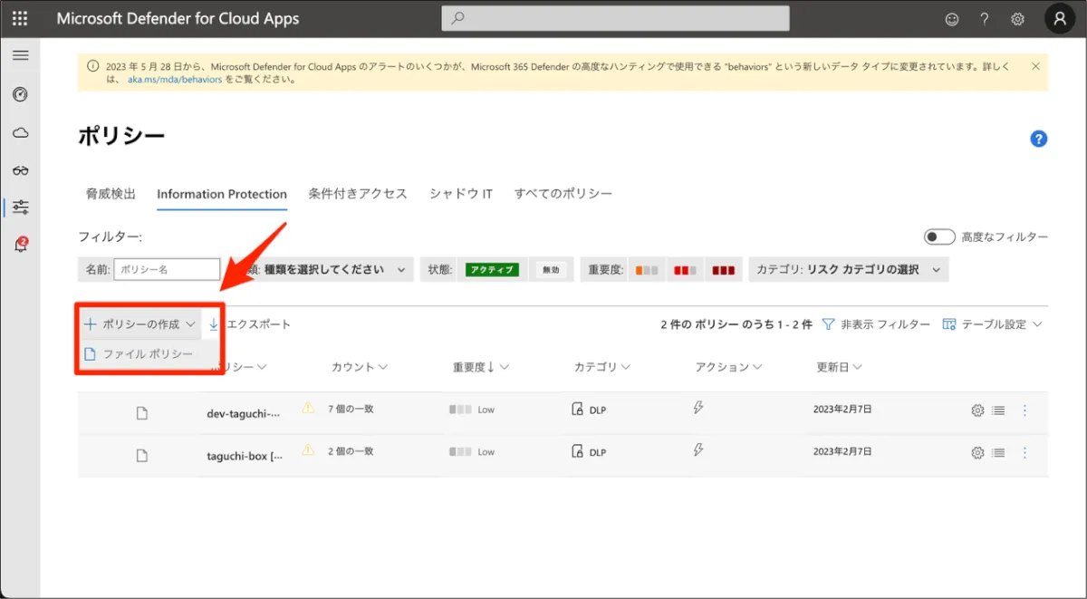 続いて、[Microsoft Defender for Cloud Apps管理センター] > [ポリシー] > [Information Protection] > [+ポリシーの作成]でファイルポリシーを作成します。