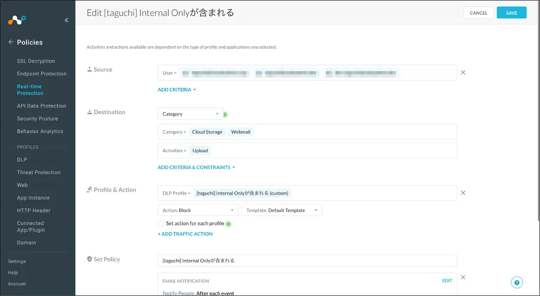 最後に、[Policies] > [Real-time Protection] > [NEW POPOLICY]からReal-time Protectionポリシーを作成します。DLP Profileでは先ほど作ったプロファイルをアタッチします。作成後は、[APPLY CHANGES]を利用してポリシーを有効化します。