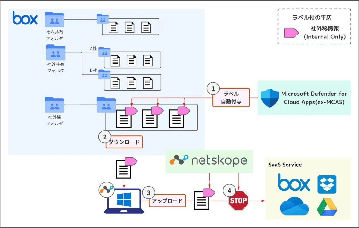 - Box上の特定のフォルダに格納されたファイルに対して、Microsoft Defender for Cloud AppsでMPIPの非暗号化ラベル(Internal Only[社外秘])を自動で付与する。