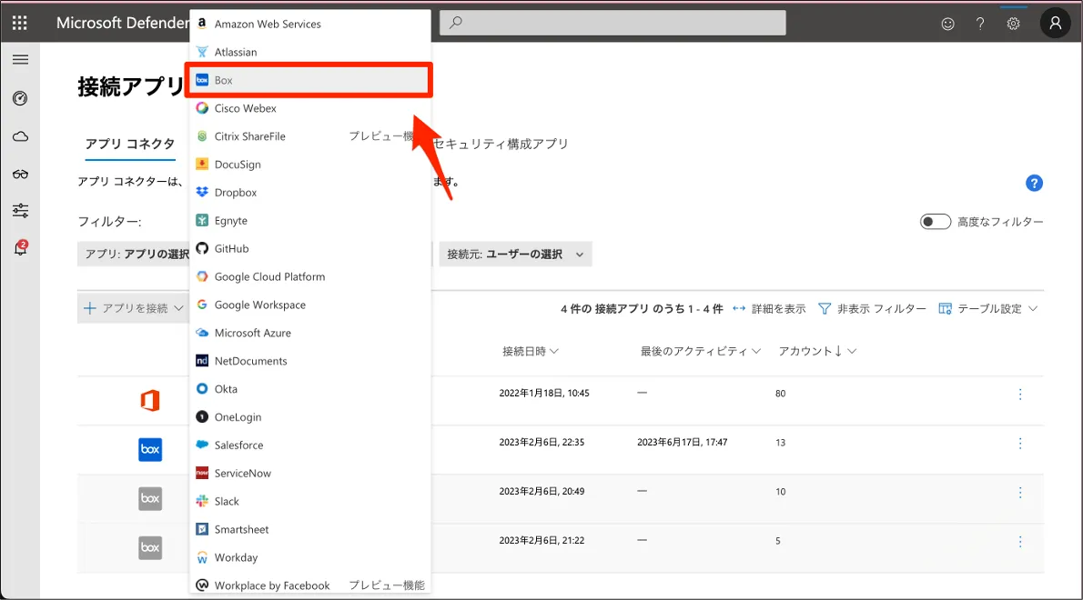 Microsoft Defender for Cloud Appsでは、Boxの特定フォルダに格納されたファイルの自動ラベル付設定を行います。まずは、BoxとMicrosoft Defender for Cloud Appsの接続です。[Microsoft Defender for Cloud Apps管理センター] > [調査] > [接続アプリ] > [+アプリを接続]でBoxと接続設定を行います。