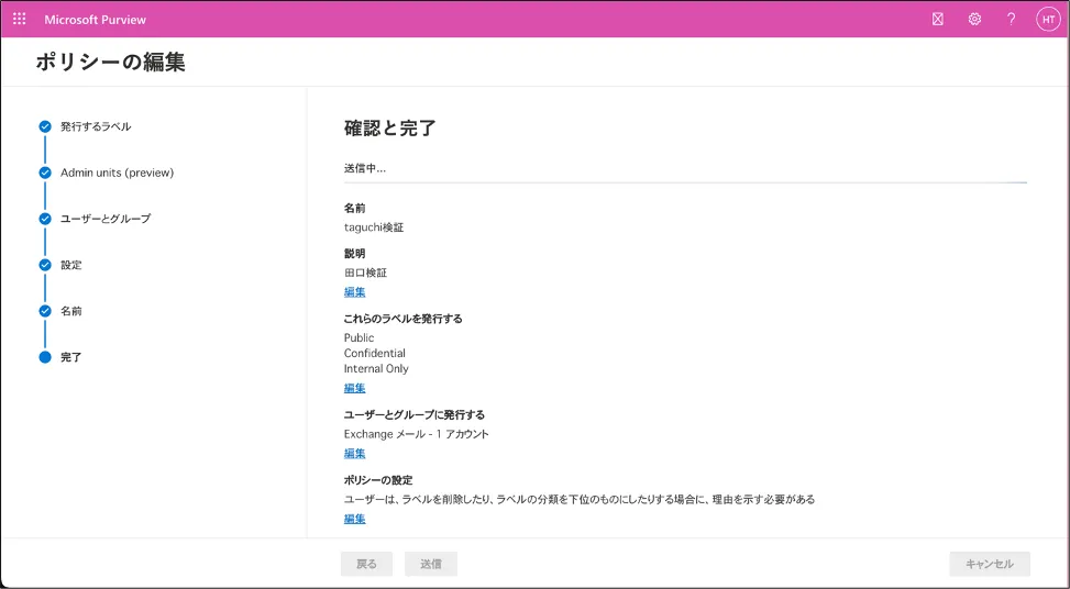 そして、上で作成した3つのラベルを利用してラベルポリシーを作成します。[Microsoft Purview管理センター] > [情報保護] > [ラベルポリシー]でラベルポリシーを作成することで、ユーザーはファイル等に対してラベル付を行うことができるようになります。