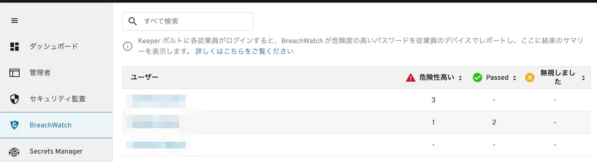 ユーザーがパスワードマネージャーに登録したパスワードの複雑さはどうか、使い回ししていないか、ダークウェブに流通しているような脆弱なパスワードを使っていないかを管理者側からチェックすることができます。なお、具体的なパスワード文字列は見えません。